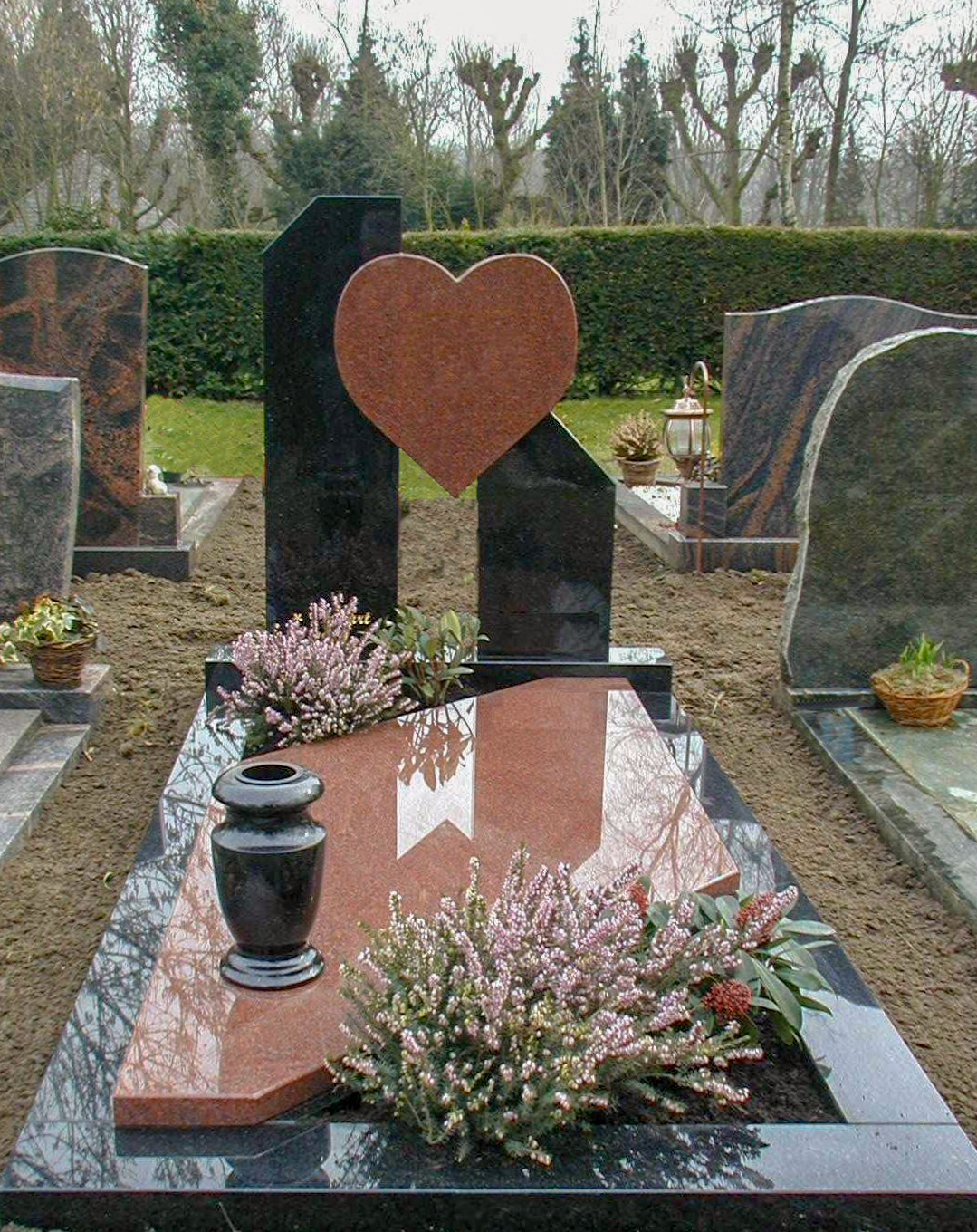 Enkel graf met hart en dekplaat met afgeschuinde hoeken in Zwart Graniet en Inian Red