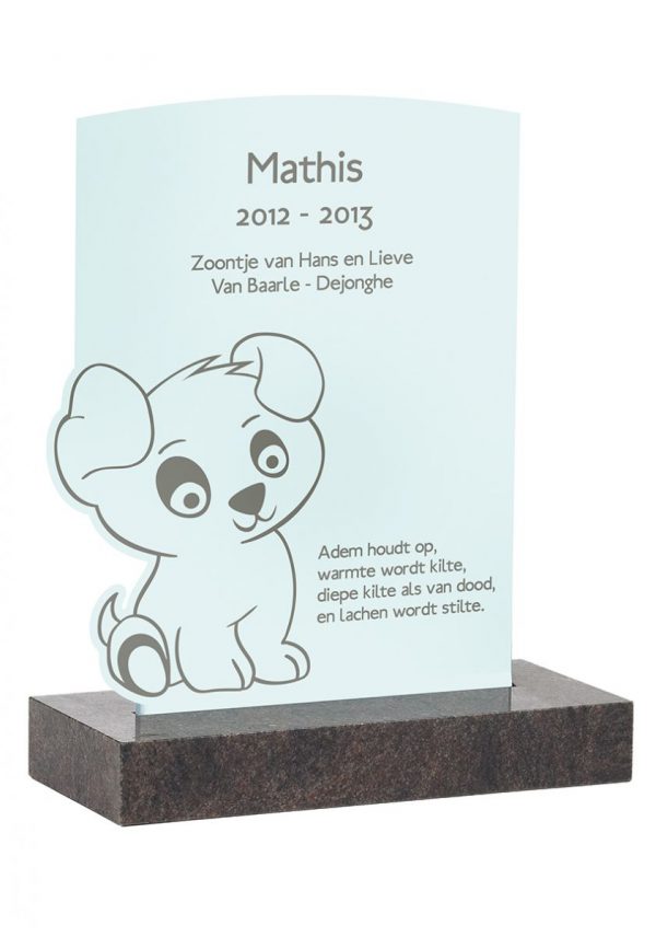 Kinder graf met staande glasplaat op Zwart Granieten voetstuk